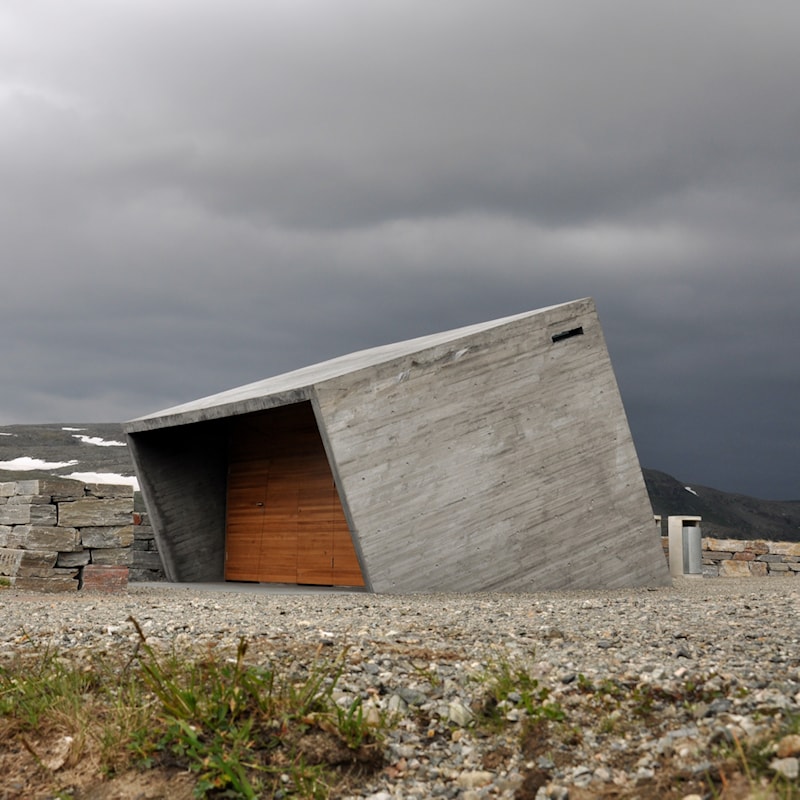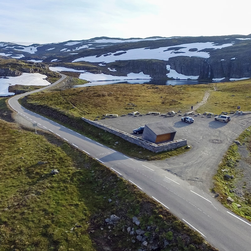 Her er eit nytt landskapsrom med slake høgdedrag, vide sletter og med tindar og fonner i det fjerne. Rasteplassen med benkar og toalett får all nødvendig energi frå solcellepanel. Her møtes det vakre, det funksjonelle og det miljøvenlege.