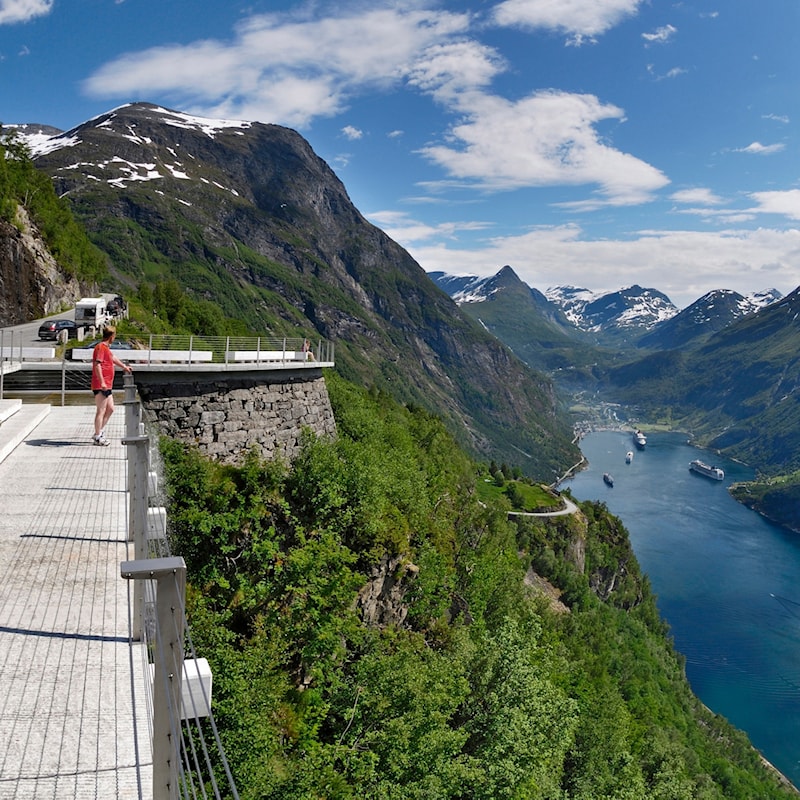 Utsiktspunktet Ørnesvingen høgt over Geirangerfjorden, Nasjonal turistveg Geiranger – Trollstigen.