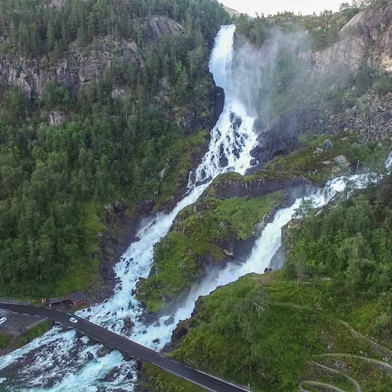 Tett inntil vegen gjennom den trange Oddadalen, styrtar Låtefossen med sine to laup 165 m nedover fjellsida.