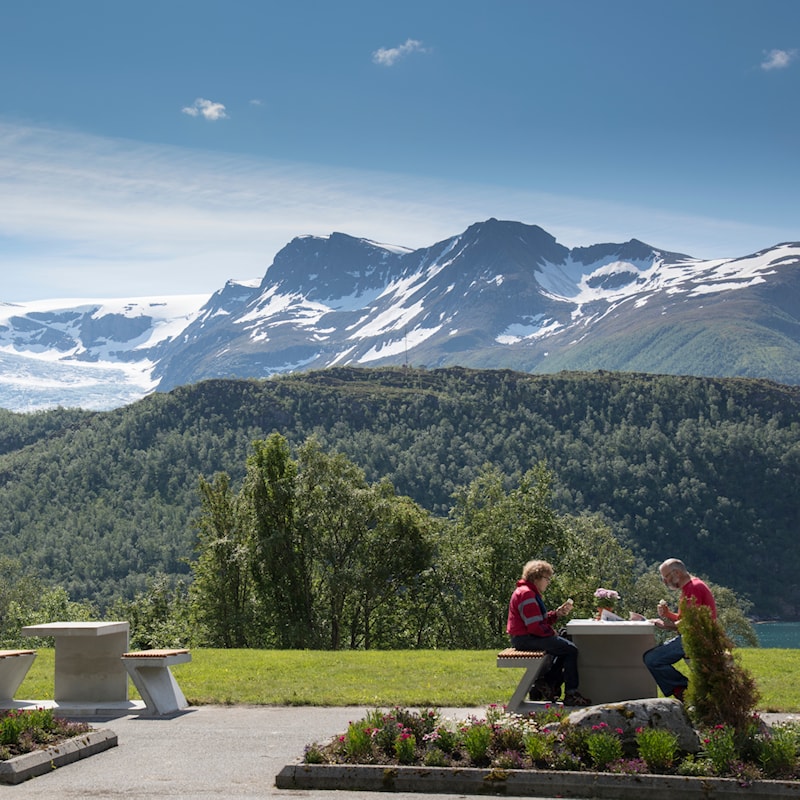 Braset med utsikt mot Engabreen, Svartisen. Braset ligger ved ved fylkesveg 17 («Kystriksvegen»), Nasjonal turistveg Helgelandskysten. Foto: Jarle Wæhler, Statens vegvesen