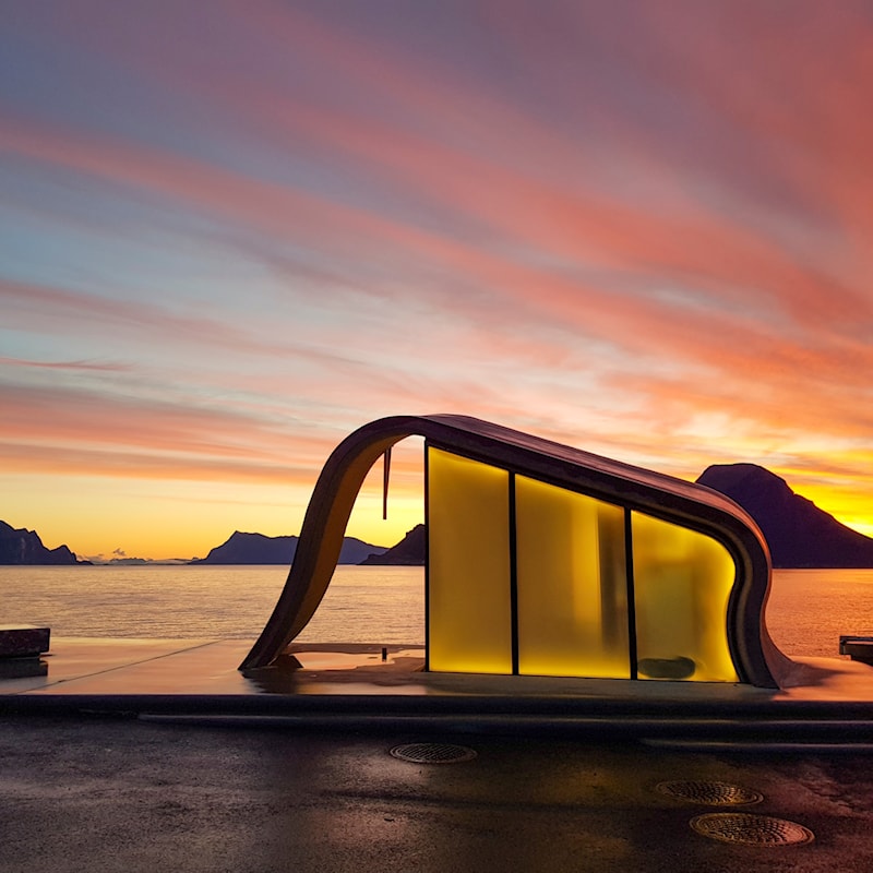 Toalettbygg og uteanlegg på Ureddplassen ved fylkesveg 17 i Gildeskål, Nordland, Nasjonal turistveg Helgelandskysten.