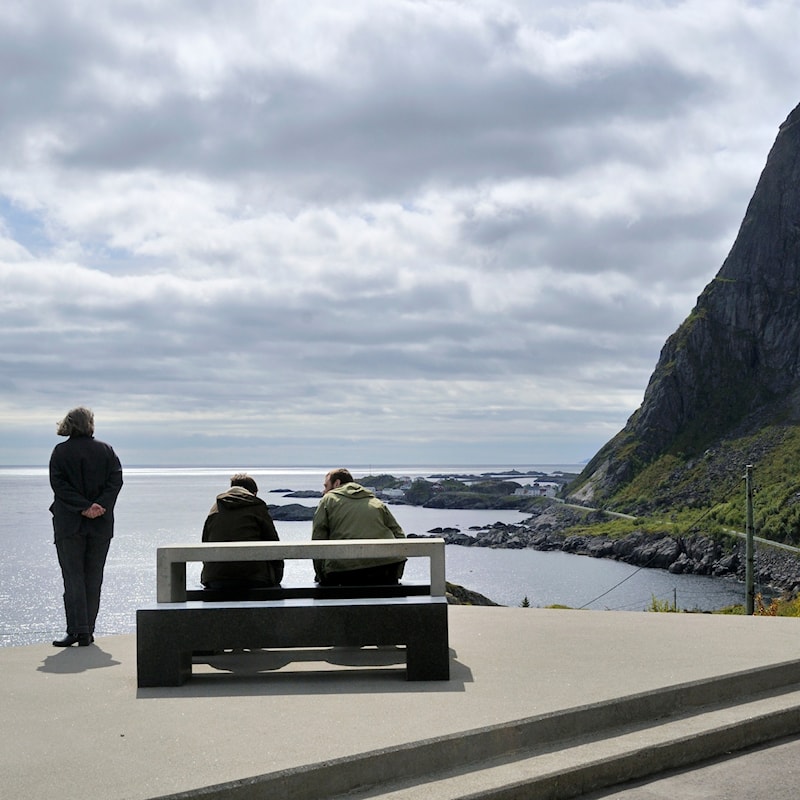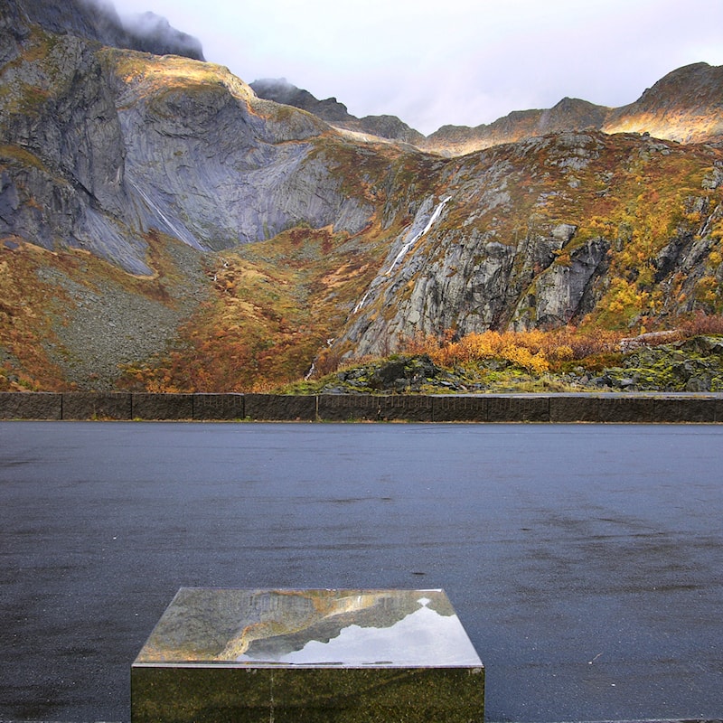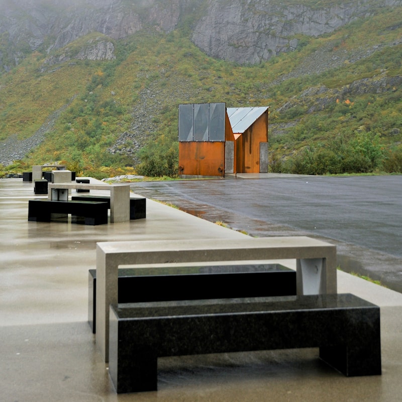 Rasteplassmøbler i stein og betong på Akkarvikodden rasteplass. Foto: Steinar Skaar, Statens vegvesen