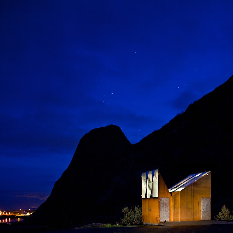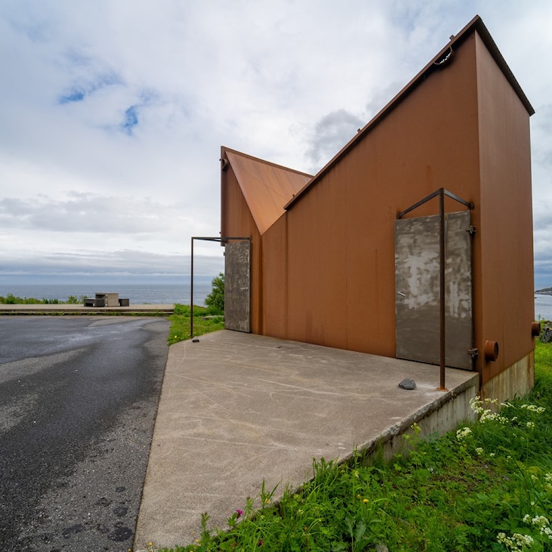 Rasteplassen har horisontale flater, tydelige linjer og møbler i granitt. Toalettbygningen er karakteristisk og ligner de stupbratte fjellene i den rå og nakne Vestfjords-naturen.