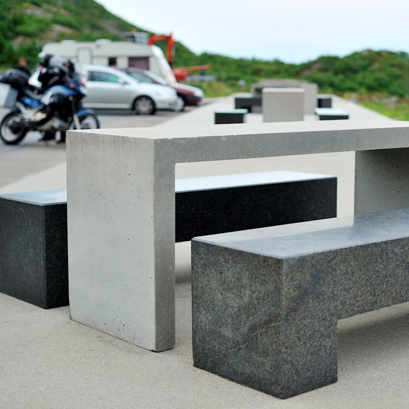 Rasteplassmøbler i stein og betong på Akkarvikodden rasteplass.