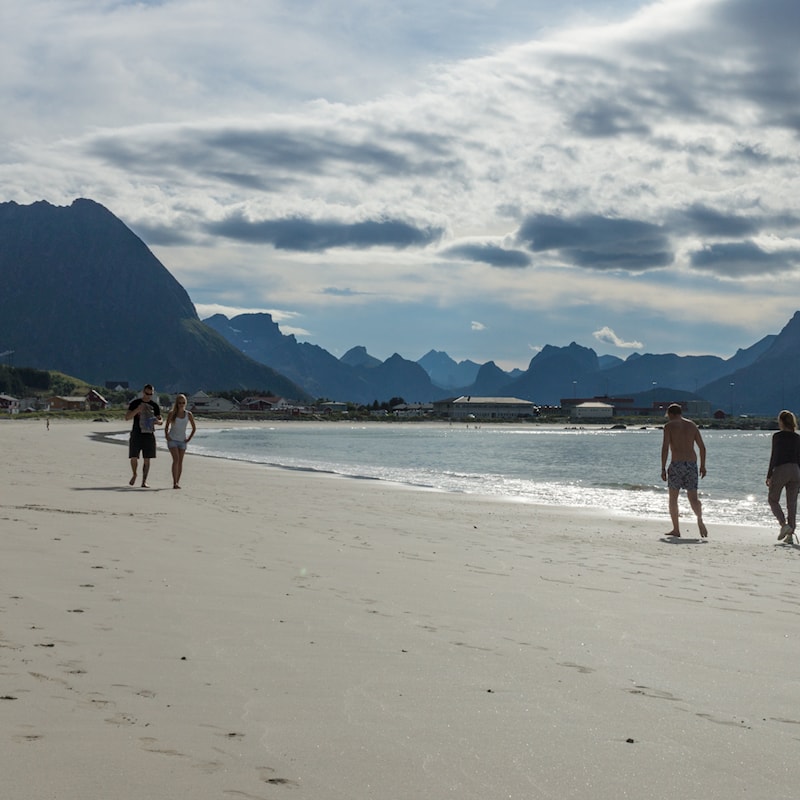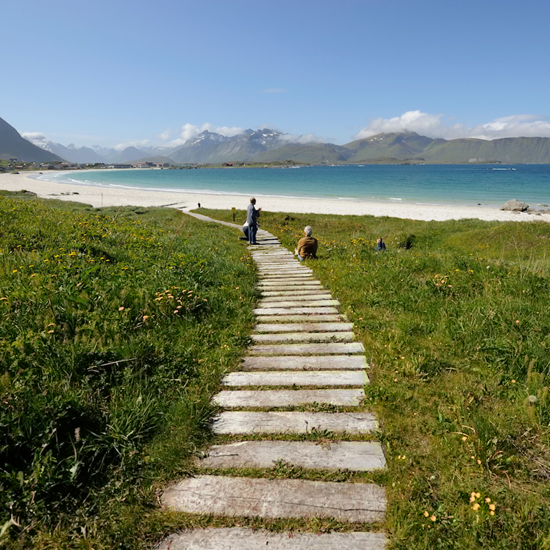 Med grønt gress, blått hav og majestetiske fjell som omgivelser er Rambergstranda en god opplevelse. En smal sti av tresviller leder ned til stranda.
