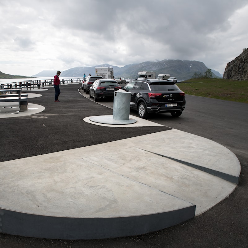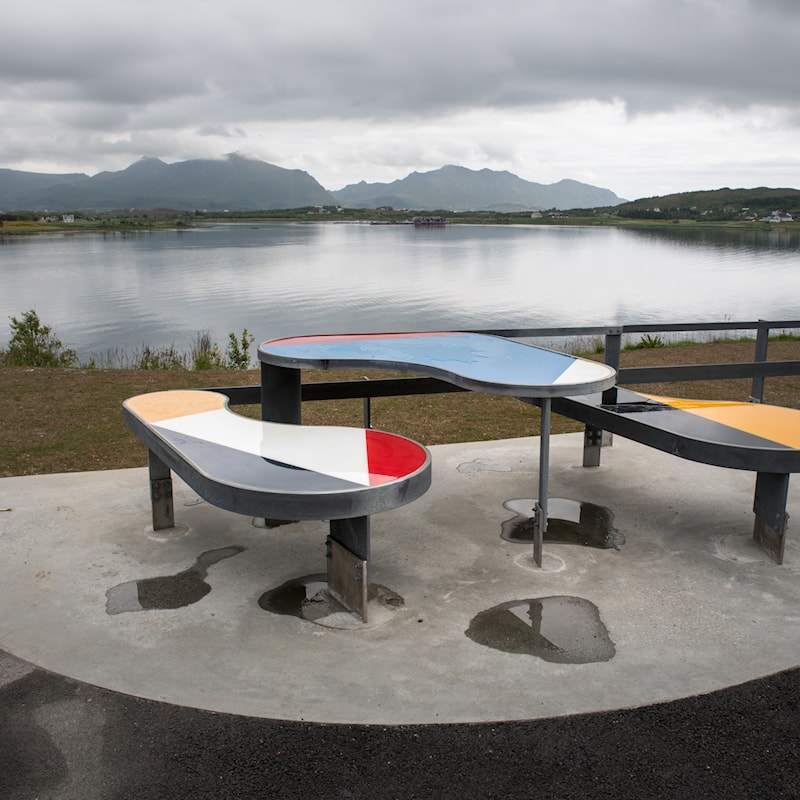 Utsikten utover fjorden mot Gravdal, Offersøystraumen, Nappstraumen og fjellene i sør er praktfull. Plassen er godt skjermet for trafikkstøy og de fargeglade bordene og benkene i myke former inviterer til en lengre stopp.