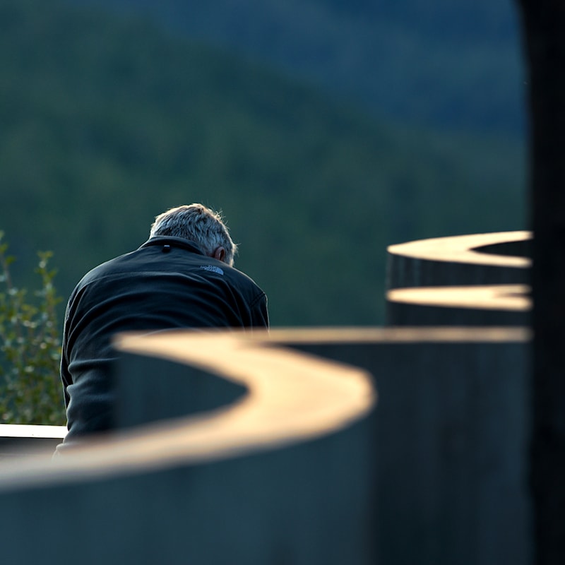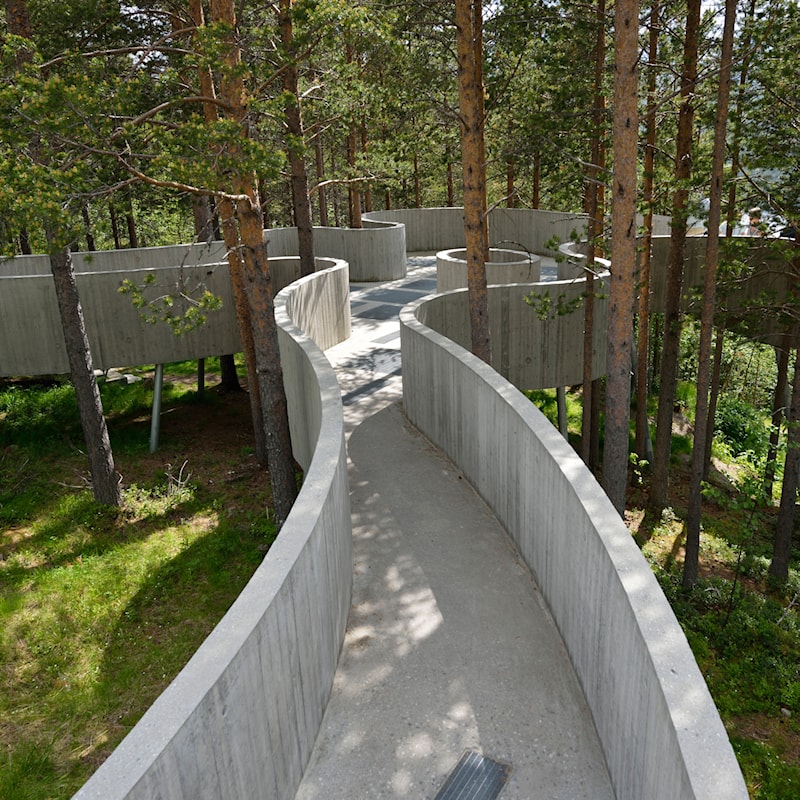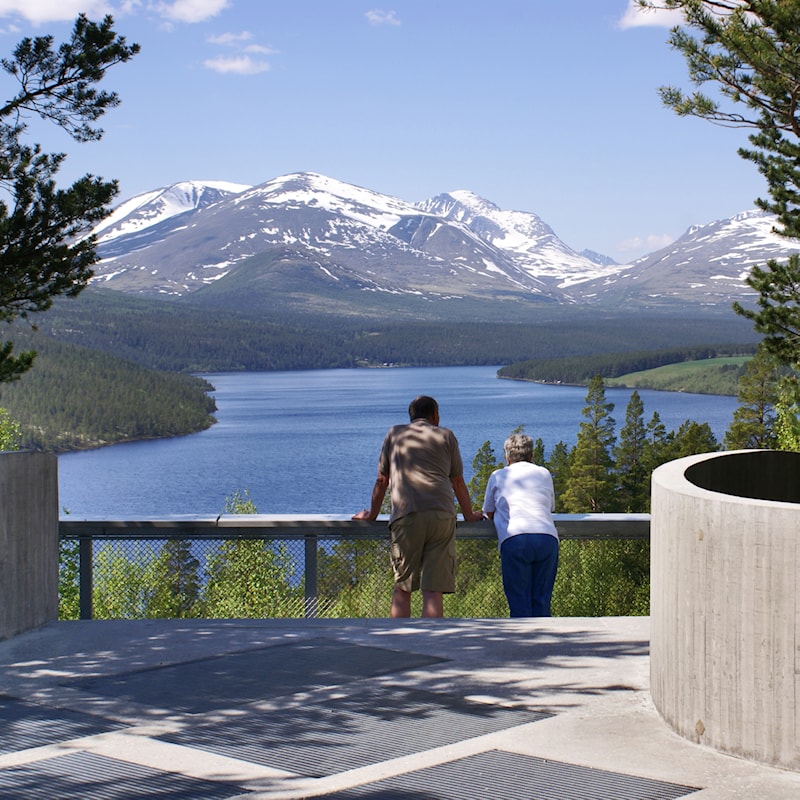 Ved Atnsjøen ligger utsiktsplattformen Sohlbergplassen som svinger seg mellom slanke furutrær.
