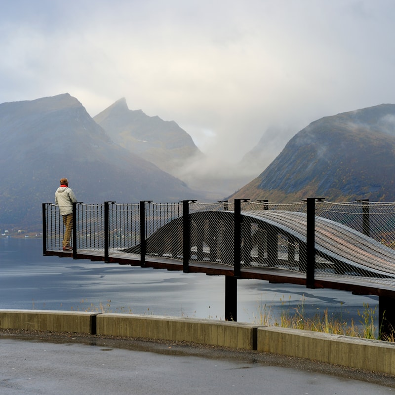På en 44 meter lang plattform kan du nyte den storslåtte utsikten over Bergsfjorden og de høye fjellene rundt.