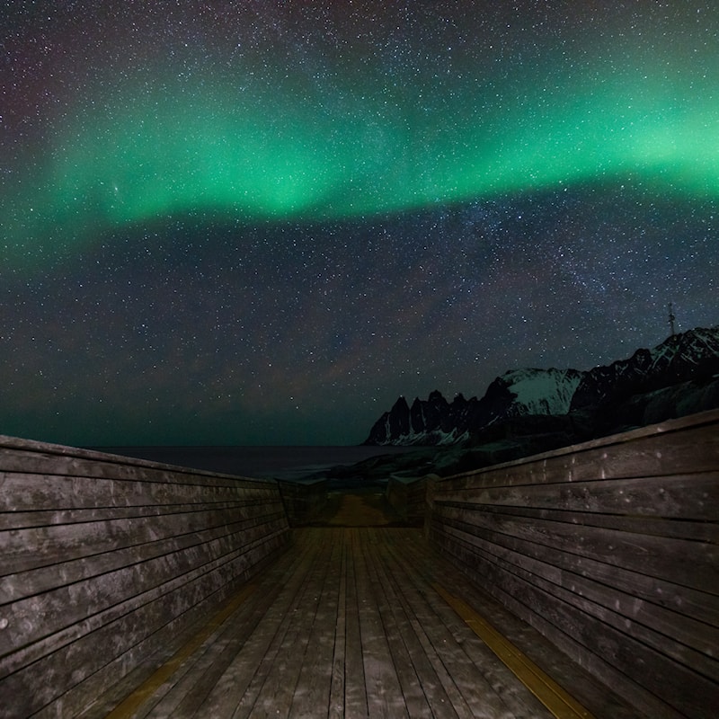 En gangbane i sibirsk lerk leder ut over svabergene med utsikt til Nordsjøen i vest og fjellet Oksen med de skarpe tindene i nord.