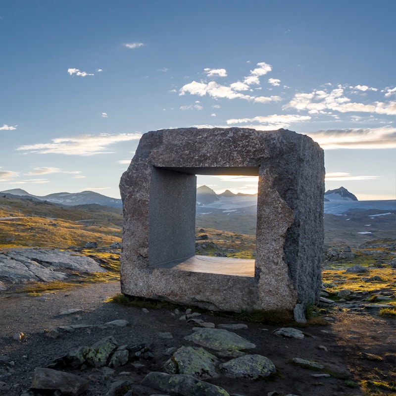 Skyfront med tåke kommer inn over Sognefjellet. Bildet viser Knut Wolds kunstinstallasjon ved Mefjellet rasteplass ved Nasjonal turistveg Sognefjellet.