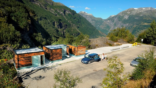 Arkitekt Sixten Rahlff har hatt lokale byggetradisjoner i bakhodet da han tegnet toalettene og informasjonstavlene ved Flydalsjuvet. Rasteplassen ligger ved den bratte fjellsiden i enden av Geirangerfjorden. Flere hundre år gammelt laftetømmer ble benyttet i byggingen av toalett og informasjonspunkt. Det laftede tømmeret er satt sammen med transparente glassvegger som lar lyset slippe inn samtidig som det ikke er mulig å se igjennom.